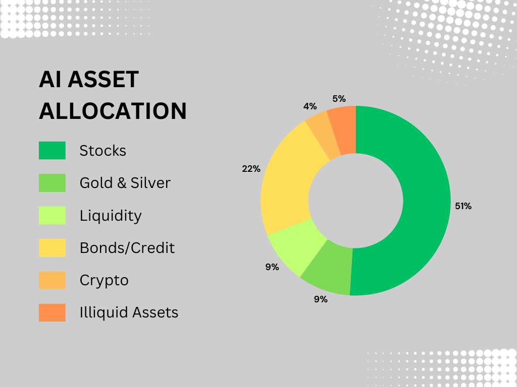 AI, however, leans heavily toward bonds, valuing their income, low volatility, and negative correlation with stocks during recessions. Their suggested allocation looks like this: stocks 51%, gold & silver 9%, liquidity 9%, bonds/credit 22%, crypto 4%, illiquid assets (real estate, cars…) 5% (Portfolio B)