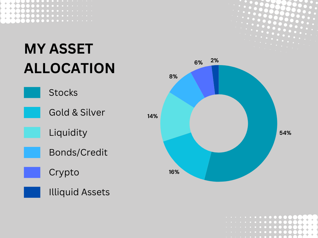 Portfolio A: stocks 54%, gold & silver 16%, liquidity 14%, bonds/credit 8%, crypto 6%, illiquid assets 2%